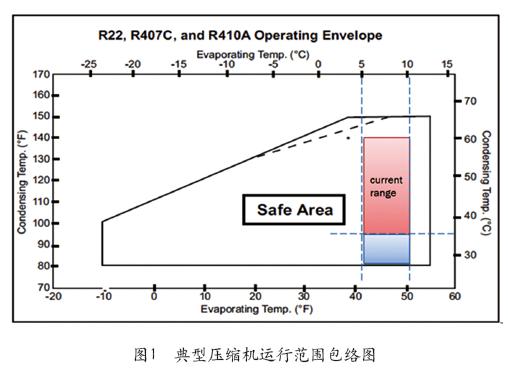我們知道傳統(tǒng)風(fēng)冷空調(diào)在過渡季節(jié)當(dāng)室外環(huán)境溫度降低時(shí),冷凝器冷凝效果變好,冷凝溫度會(huì)降低,此時(shí)壓縮機(jī)功耗也會(huì)降低。理論上,壓縮機(jī)工作點(diǎn)只要落在壓縮機(jī)運(yùn)行包絡(luò)區(qū)域安全范圍內(nèi)(見圖1中整個(gè)safeAres區(qū)),冷凝溫度越低越好,最低可將降到25℃左右。但我們還需要設(shè)定冷凝風(fēng)機(jī)調(diào)速控制器或冷凝壓力控制閥,來限制冷凝溫度(冷凝壓力)降低、減弱冷凝能力,這是為什么呢?