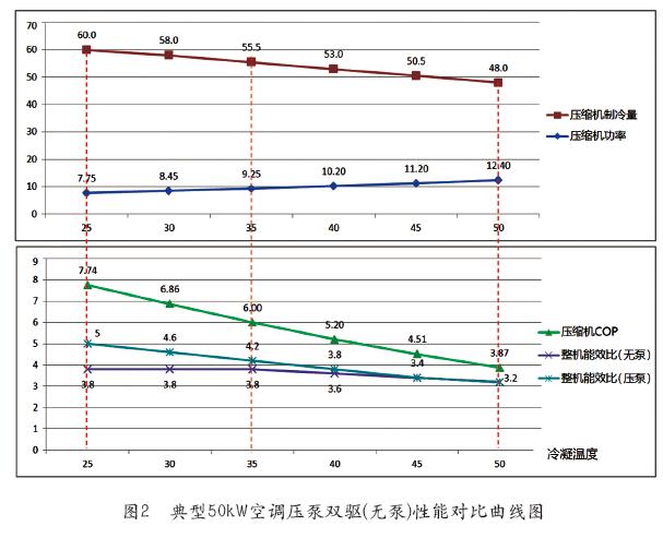 如圖2典型50kW壓縮機(jī)和氟泵雙驅(qū)空調(diào)與未采用氟泵技術(shù)空調(diào)制冷量及能效隨冷凝溫度變化曲線圖所示,冷凝溫度繼續(xù)降低至25℃,壓縮機(jī)功耗較之35℃可降低16%,制冷量增大8%,整機(jī)能效提高31%。