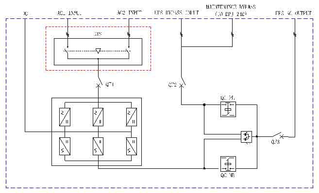 靜態(tài)開關(guān)采用混合型控制技術(shù),由快速半導(dǎo)體器件(可控硅)和電磁接觸器并聯(lián)組成的高效AC開關(guān),它既解決了切換時間問題,又提高了靜態(tài)開關(guān)的抗沖擊和抗短路能力,使系統(tǒng)的可靠性、穩(wěn)定性大大提高。