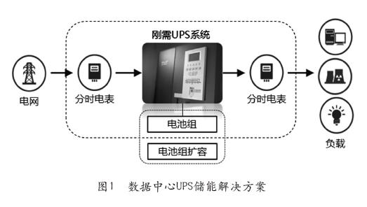 首先,作為儲(chǔ)能應(yīng)用的UPS須先擴(kuò)容電池組,讓全電池組參與儲(chǔ)能。電池容量的設(shè)計(jì)一定要保證60%作為儲(chǔ)能來用,剩余的40%作為UPS后備供電,如此才能讓電源充分滿足用戶的剛性用電需求。這套設(shè)計(jì)方案改造工程量小,系統(tǒng)收益率高,特別適用于數(shù)據(jù)中心、大型商業(yè)體。數(shù)據(jù)中心UPS儲(chǔ)能解決方案如圖1所示。