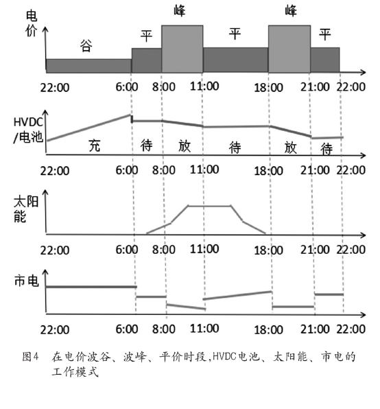 高壓直流型儲(chǔ)能方案如圖3所示,它打造了一個(gè)直流微網(wǎng)的方案,通過高壓直流給電池充電,同時(shí)給設(shè)備供電。這套方案可以將光伏、風(fēng)機(jī)無縫并到直流系統(tǒng)里面,組成儲(chǔ)能系統(tǒng),但是原有系統(tǒng)卻無需改造。在電價(jià)波谷、波峰、平價(jià)時(shí)段,HVDC/電池、太陽能、市電的工作模式如圖4所示。