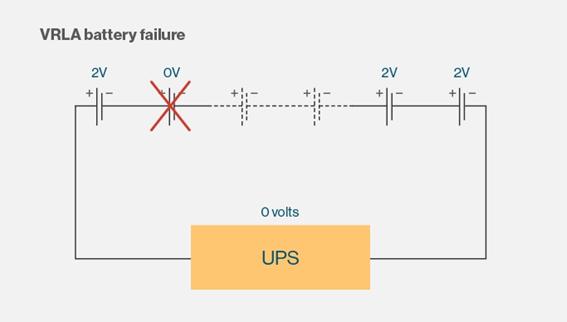VRLA電池通常會(huì)造成全體失效:一個(gè)故障會(huì)導(dǎo)致整組電池串失效,沒有任何跡象能顯示具體是那個(gè)電池出的問題(見圖2)。濕式電池失效故障或短路,會(huì)導(dǎo)致電池串總電壓降低,但UPS還是可以持續(xù)傳輸電能。