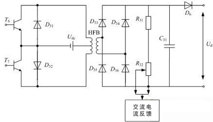 DC/DC電路的構(gòu)成如圖4所示,主要是由高頻變壓器、功率管T6、T7,整流二極管D33、D34、D35、D36,電容C31等組成。該部分采用直流電壓環(huán)反饋控制,變換后的電壓通過二極管D6與PFC的輸出端相連。