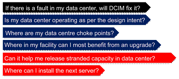 沒有人可以準(zhǔn)確定義描述DCIM或DCIM應(yīng)該做些什么。而一個錯誤的假設(shè)是,DCIM將修復(fù)你的數(shù)據(jù)中心,因此在圖5中的第一個問題是DCIM產(chǎn)品在市場上的虛假陳述的問題?,F(xiàn)實情況是,DCIM的一個最基本的功能應(yīng)該是對于基礎(chǔ)架構(gòu)的性能和需要關(guān)注的突出問題提供一個更為深刻的見解,并解決重大風(fēng)險。最值得注意的是,這些領(lǐng)域包括數(shù)據(jù)中心是否在設(shè)計意圖實施,基礎(chǔ)設(shè)施的容量限制(“瓶頸點”),資本項目的評估,確定閑置的容量,并為下一次部署的服務(wù)器分配一個合適的位置。