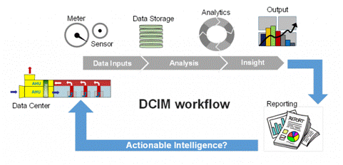 在業(yè)界已經(jīng)有許多不同的模型描述了DCIM工作流(見圖4)。他們中的大多數(shù)認(rèn)為大規(guī)模收集來自傳感器和儀表的數(shù)據(jù)和存儲。這個數(shù)據(jù)被用作輸入到子系統(tǒng)分析,如環(huán)境控制、功率和能量管理、安全性,以及IT系統(tǒng)。并為數(shù)據(jù)中心操作者將輸出顯示在儀表上。此輸出結(jié)果是否可以提供可操作的信息,或只是用五顏六色的計量數(shù)據(jù)表示是必須解決的問題,將更多的功能整合到DCIM系統(tǒng)中,并成為數(shù)據(jù)中心運(yùn)營和管理使用制度。而解決這些問題對于數(shù)據(jù)中心運(yùn)營商來說是提高了價值(如果有),DCIM在這方面將會超越BMS系統(tǒng)平臺。