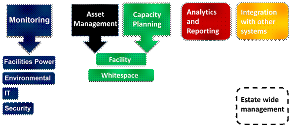 圖1顯示了數(shù)據(jù)中心的主要DCIM領(lǐng)域,從發(fā)電機(jī)、電力室、數(shù)據(jù)大廳和IT設(shè)備,另外還配置了集安全性和一體化的樓宇管理系統(tǒng)(BMS)。DCIM系統(tǒng)可以對數(shù)據(jù)中心區(qū)域提供監(jiān)控和管理服務(wù)。