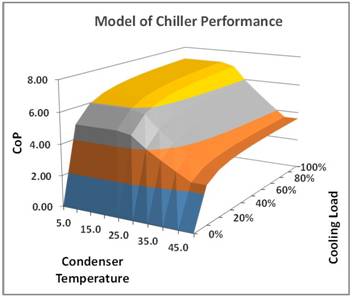 經常有人問:“我們如何計算或模擬預期的性能?”答案很簡單:數(shù)據(jù)中心中的每一個設備的性能都可以通過一個數(shù)學模型來確定。而數(shù)據(jù)中心供應商具備這個信息庫,無論是UPS、變壓器、風扇或水泵的負載與效率。圖3顯示了一個特定的制冷機對環(huán)境溫度和負載的性能系數(shù)。