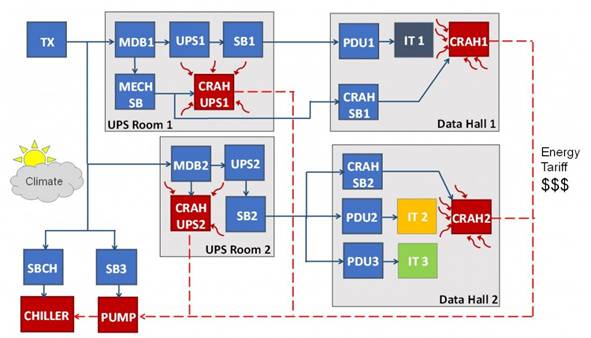 圖4 確定電源和冷卻鏈的組合數(shù)據(jù)中心的性能模型(藍色連接代表的是電源鏈,紅色連接代表的是冷卻鏈)。