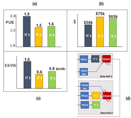 圖6從DCIM平臺啟用有用的KPI和商業(yè)智能。下圖顯示了三個不同的IT客戶在數(shù)據(jù)大廳1和數(shù)據(jù)大廳2的重要數(shù)據(jù)中心指標:(a)PUE分配,(b)支付成本,(c)美元/千瓦時,(d)數(shù)據(jù)中心配置的性能模型。