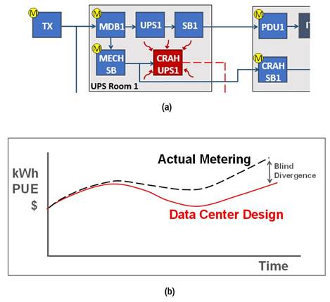 在圖5的(a)中所示的例子中,儀表被提名和數(shù)據(jù)中心的關鍵性能指標(KPI)跟蹤與預期設計性能(參見圖5b)。區(qū)別在哪里開始,見圖(5b)。它只是通過繪制的健康預期的設計從模型讀取可見。發(fā)散的常見原因是人工干預,其中有人已經改變了設置,冷卻系統(tǒng)或系統(tǒng)已經響應產生不利于載荷狀況,但只是在一定程度上還尚未成為危險項目。如果早按照圖5檢測(b)所示,設施人員能及時處理,并試圖恢復分歧的差距,并將數(shù)據(jù)中心帶回到設計。