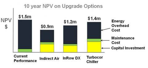 該模型需要從所有的主要數(shù)據(jù)中心項目的性能和數(shù)據(jù)的輸入,以允許在一個組件和/或系統(tǒng)級的數(shù)據(jù)中心容量利用率的評估。它有助于數(shù)據(jù)中心的計劃,并為即將到來的基礎設施維護和增強計劃,它可以幫助評估設施升級選項,而不需要長期的、復雜的、充滿錯誤的電子表格。圖8給出了一個10年的凈現(xiàn)值(NPV)為冷卻系統(tǒng)升級的計算,考慮到對能源的開銷,維修成本和所需的資本投資。在這種情況下,它很容易在較短的時間內評估升級選項的內部工程團隊,并排除那些不提供一個成本效益的商業(yè)案例。在圖8的基礎上,安裝Turbocor制冷機組10年以上將對成本沒有什么影響,而采用間接冷卻系統(tǒng)可以節(jié)約60萬美元。