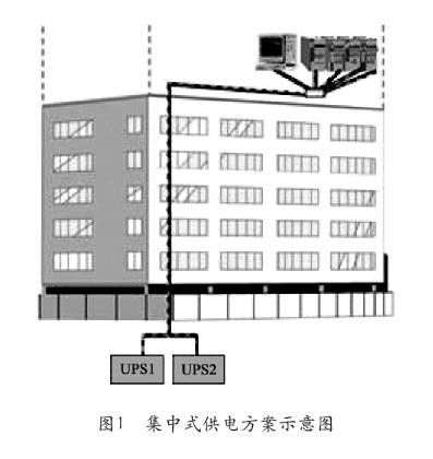 由一臺UPS組成單機(jī)供電系統(tǒng)、多臺UPS組成并聯(lián)供電或雙總線供電系統(tǒng),再通過配電集中給負(fù)載供電,這種供電方案一般情況下UPS系統(tǒng)與機(jī)房用電設(shè)備是分開的。該供電方案一般UPS的單機(jī)容量在200~400kVA較多,供電示意圖如圖1所示。