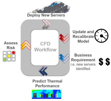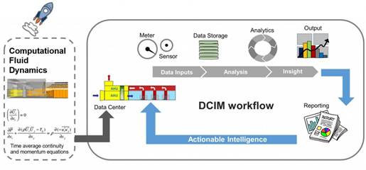 在數(shù)據(jù)中心采用計(jì)算流體力學(xué)(CFD),可以對(duì)其中的一些功能進(jìn)行更詳細(xì)的討論。圖1顯示了基于一個(gè)獨(dú)立的CFD軟件集成的DCIM工作流模型。