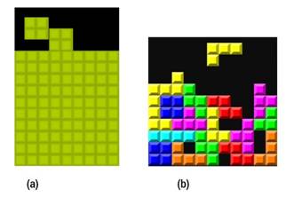 圖2 俄羅斯方塊效應(yīng)與數(shù)據(jù)中心規(guī)劃業(yè)務(wù)相似:(a)前期用方塊玩俄羅斯方塊,(b)用隨機(jī)塊序列玩俄羅斯方塊。
