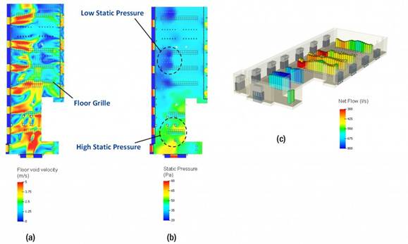 圖5演示了其原理。在圖5(a)的數(shù)據(jù)大廳左側(cè)的冷卻單元在地板上的空隙引起的氣流,這會(huì)影響在圖5(b)確定的低靜壓區(qū)域。這些區(qū)域以減少空氣流量的影響,與地板格柵圖5(c)相關(guān)。