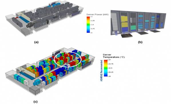圖8 使用計(jì)算流體力學(xué)來(lái)測(cè)試IT部署策略:(a)設(shè)施模型和IT庫(kù)存,(b)更新的服務(wù)器電源圖,(c)預(yù)測(cè)的機(jī)柜的空氣入口溫度。