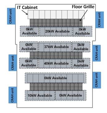 在圖8(a)中,數(shù)據(jù)中心運(yùn)營(yíng)商有一個(gè)虛擬的設(shè)施模型和IT庫(kù)存。IT經(jīng)理確定新的服務(wù)器被部署的要求,并為它們分配機(jī)柜上的可用空間和電力容量(圖8b)。而通過(guò)虛擬設(shè)備模型預(yù)測(cè)發(fā)現(xiàn),這樣的配置將出現(xiàn)散熱問(wèn)題,如圖8(c)所示,其中的圓圈區(qū)域表示服務(wù)器的空氣平均進(jìn)氣溫度大于27攝氏度,設(shè)施人員可以其確定適當(dāng)?shù)奈恢?,并通過(guò)這些服務(wù)器的虛擬模型與IT經(jīng)理進(jìn)行協(xié)調(diào)。這方面的努力可能涉及到幾個(gè)迭代的工作流模型,如圖7所示。其最終的結(jié)果是設(shè)施將得到不斷發(fā)展,如圖9所示的冷卻地圖,顯示了在不同的機(jī)柜位置的冷卻可用性。