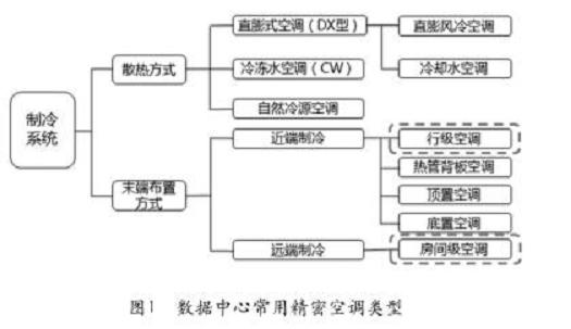 在目前的精密空調(diào)主流應用中,從末端布置方式而言,主要有近端制冷的行級空調(diào)和遠端制冷的房間級空調(diào)兩種;從散熱方式而言,分直膨式散熱和冷凍水散熱兩種方式,數(shù)據(jù)中心常用制冷系統(tǒng)如圖1所示。