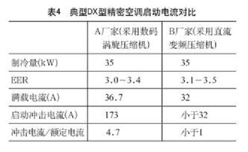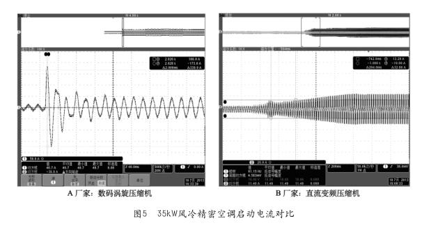 根據(jù)A、B兩個廠家提供的技術(shù)參數(shù)并結(jié)合測試結(jié)果,采用數(shù)碼渦旋壓縮機的DX型精密空調(diào),其啟動沖擊電流約為額定電流的5倍;而采用直流變頻壓縮機的DX型精密空調(diào),其啟動電流小于額定電流。