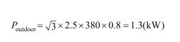 例如,假設在T1工況(溫帶氣候,環(huán)境溫度在-20~45℃),對于散熱量為38kW風冷室外機,其輸入制式為380~415Vac/3Ph/50或60Hz,滿載電流為2.5A,功率因數(shù)取0.8,則室外機功率為