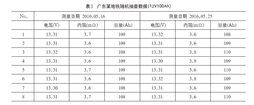 根據(jù)調(diào)查,在北美Switch數(shù)據(jù)中心、Latisys數(shù)據(jù)中心、DigitalRealityTrust數(shù)據(jù)中心、Facebook數(shù)據(jù)中心、香港機(jī)場、香港地鐵、廣州地鐵等用戶中,均有大量的純鉛薄極板電池在投入使用,經(jīng)過長時(shí)間跟蹤測試發(fā)現(xiàn),純鉛薄極板電池均一性好、使用溫度范圍寬、支持間歇式充電、無一例發(fā)現(xiàn)有電池變形、漏液等明顯的制造瑕疵,用戶普遍評價(jià)較好。表3為廣東某地鐵隨機(jī)抽查數(shù)據(jù)(12V100Ah)。