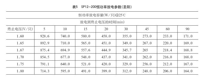 現(xiàn)以圣陽閥控鉛酸蓄電池產(chǎn)品SP12-200為例,按恒功率放電特性選擇蓄電池。查SP12-200恒功率放電參數(shù)表(見表5)可知,放電20min,終止電壓為1.67V/只時的功率為444.9W。