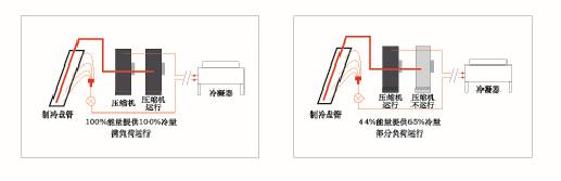 u 部分負荷運行:主壓縮機運行,60%的冷媒作制冷循環(huán),這樣蒸發(fā)盤管和冷凝盤管相對而言能力過量,冷媒吸入壓力增加而排出壓力減少,部分負荷性能系數(shù)可增大到5.0,既44%的能量即可輸出65%的制冷量;