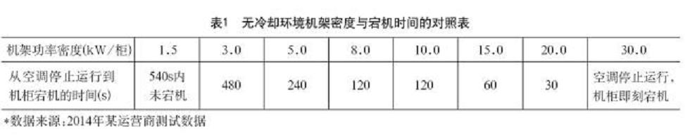 表1為2014年某運(yùn)營(yíng)商機(jī)架密度與宕機(jī)時(shí)間對(duì)照表,可以看出,機(jī)架密度達(dá)到5kW/柜后,一旦空調(diào)停止運(yùn)行,機(jī)柜僅持續(xù)4min后即宕機(jī),并且隨著機(jī)柜密度的提升持續(xù)時(shí)間會(huì)變得更短。因此停電后即使負(fù)載有UPS繼續(xù)供電,哪怕電池備電時(shí)間延長(zhǎng)也是毫無(wú)意義的。