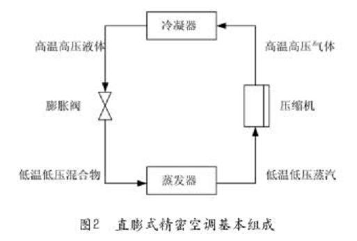 直膨式精密空調(diào)系統(tǒng)由蒸發(fā)器、壓縮機(jī)、冷凝器和節(jié)流裝置(膨脹閥)組成。圖2為直膨式空調(diào)系統(tǒng)的基本組成。實(shí)際使用時(shí),為了便于蒸發(fā)器和冷凝器工作,需要為它們各自配套強(qiáng)制對(duì)流的風(fēng)機(jī),并將蒸發(fā)器和冷凝器安裝在不同的室內(nèi)和室外兩個(gè)殼體內(nèi)(也稱室內(nèi)機(jī)和室外機(jī))。
