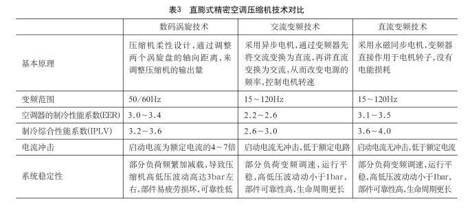目前,直膨式精密空調(diào)行業(yè)里,室內(nèi)機(jī)的制冷壓縮機(jī)主要采用渦旋式壓縮機(jī)進(jìn)行變?nèi)萘空{(diào)節(jié)。渦旋式壓縮機(jī)通常采用數(shù)碼渦旋技術(shù)、交流變頻技術(shù)和直流變頻技術(shù)實(shí)現(xiàn)變?nèi)萘空{(diào)節(jié),三者的技術(shù)對(duì)比見表3: