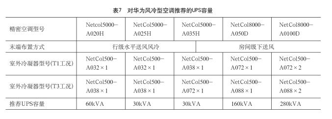 考慮對(duì)華為公司提供的風(fēng)冷型精密空調(diào)全部采用UPS進(jìn)行配電,根據(jù)推薦的配置部件,按照上述配置原則,推薦的UPS容量見表7。