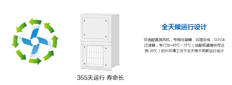 可選配支流風(fēng)機(jī),專(zhuān)用冷凝器,加濕總成,G3/G4過(guò)濾器,專(zhuān)門(mén)為+45℃~-15℃(選配低溫模塊可達(dá)到-30℃)的外環(huán)境工況下全天候不間斷運(yùn)行設(shè)計(jì)。