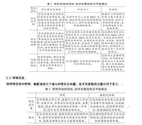 將電機(jī)系統(tǒng)中變壓器、發(fā)電機(jī)、外電引入、電動機(jī)幾個部分的現(xiàn)狀及問題、技術(shù)發(fā)展趨勢及建議列于表1。