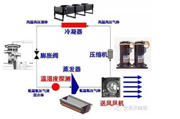 一般來(lái)說(shuō)空調(diào)機(jī)的制冷過(guò)程為:壓縮機(jī)將經(jīng)過(guò)蒸發(fā)器后吸收了熱能的制冷劑氣體壓縮成高壓氣體,然后送到室外機(jī)的冷凝器;冷凝器將高溫高壓氣體的熱能通過(guò)風(fēng)扇向周?chē)諝庵嗅尫?,使高溫高壓的氣體制冷劑重新凝結(jié)成液體,然后送到膨脹閥;膨脹閥將冷凝器管道送來(lái)的液體制冷劑降溫后變成液、氣混合態(tài)的制冷劑,然后送到蒸發(fā)器回路中去;蒸發(fā)器將液、氣混合態(tài)的制冷劑通過(guò)吸收機(jī)房環(huán)境中的熱量重新蒸發(fā)成氣態(tài)制冷劑,然后又送回到壓縮機(jī),重復(fù)前面的過(guò)程。