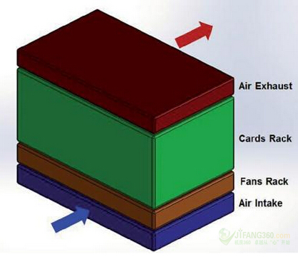 冷卻系統(tǒng)的組織,是為了使其符合機(jī)架供應(yīng)商的標(biāo)準(zhǔn)。如圖1所示,其顯示了我們最終的設(shè)計(jì)草圖。進(jìn)氣口是在前端的底部,而空氣的排出口是在頂部的背面或頂部??諝饬魇菑臋C(jī)架的底部流到頂部。最小空氣流量為每秒0.2立方米(m3/s)或420立方英尺每分鐘(cfm)。這一空氣流被定義了,以便該系統(tǒng)將能夠與現(xiàn)有的卡和機(jī)架向后兼容。機(jī)架的大小被固定在大約0.4 m x 0.44 m x 0.25 m (H x W x D),這意味著系統(tǒng)中的空氣每秒將被替換約四次。