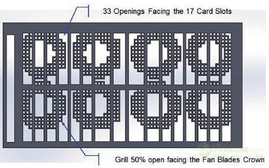 我們創(chuàng)建了一個(gè)多孔板,其具有兩個(gè)主要功能:1)在沒(méi)有插槽的地方停止氣流流動(dòng),以避免將空氣吹入封閉的EMI屏蔽物;2)在我們觀察到較高的氣流速度的區(qū)域減少氣流流動(dòng)。這個(gè)多孔流體分配板(FDP),如圖9所示,必須是與該EMI屏蔽接觸。其將從而在入口處關(guān)閉,由卡機(jī)架的另一側(cè)已經(jīng)關(guān)閉了蜂窩孔格封閉。因?yàn)榘宀恍枰S護(hù),它可以連接到EMI屏蔽代替風(fēng)扇機(jī)架。風(fēng)扇和該多孔板之間的距離是至關(guān)重要的。氣流必須能夠被通過(guò)開(kāi)口槽而不產(chǎn)生不可接受的壓力下降。