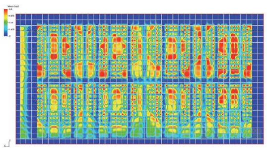 我們從三個(gè)模擬的壓降與距離的相關(guān)數(shù)據(jù)繪制了一幅曲線圖(圖10),這表明30毫米(1.2英寸)是空間相對(duì)于具有良好的空氣流動(dòng)分布的壓降的良好折衷。該板未產(chǎn)生充分均勻的流動(dòng)(圖11),而是由卡的改進(jìn)產(chǎn)生的壓降改進(jìn)了氣流分布。在每個(gè)卡插槽進(jìn)氣口的最終模擬和全球模擬的空氣流量測(cè)量顯示來(lái)自從左到右,由前向后可接受的分布。