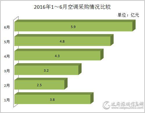 上半年,各月空調(diào)采購規(guī)模分別為3.8億元、2.5億元、3.2億元、4.3億元、4.8億元和6億元。